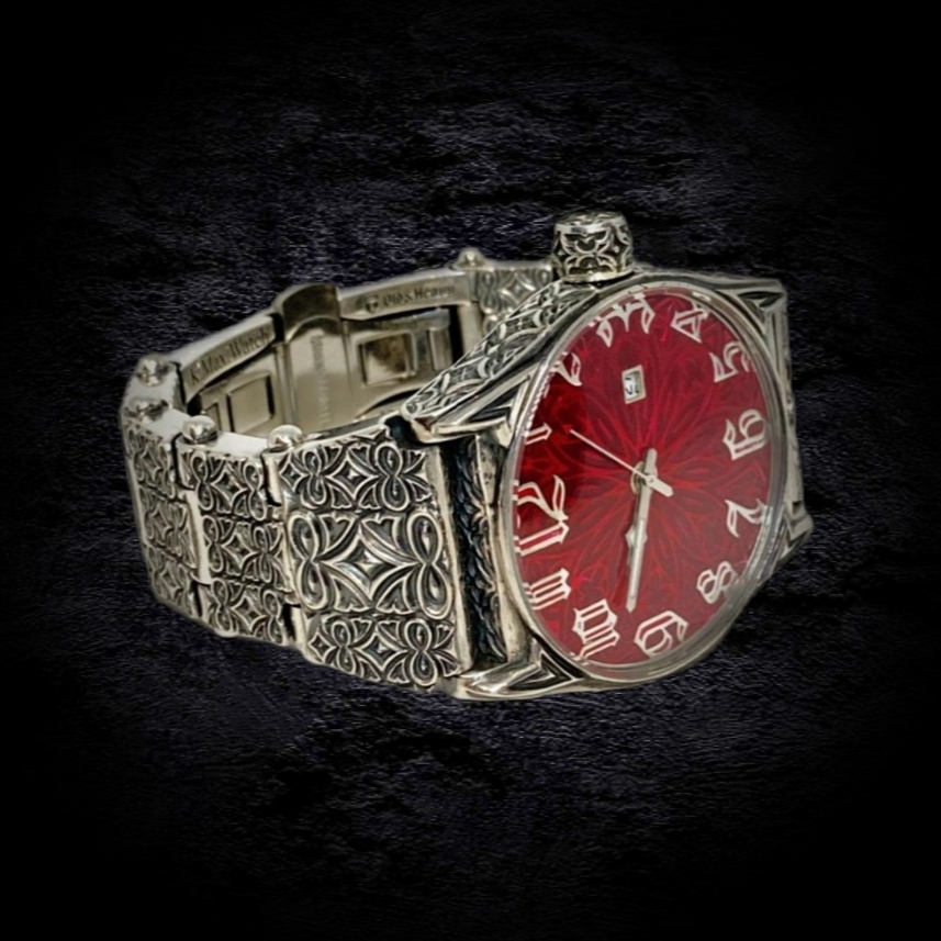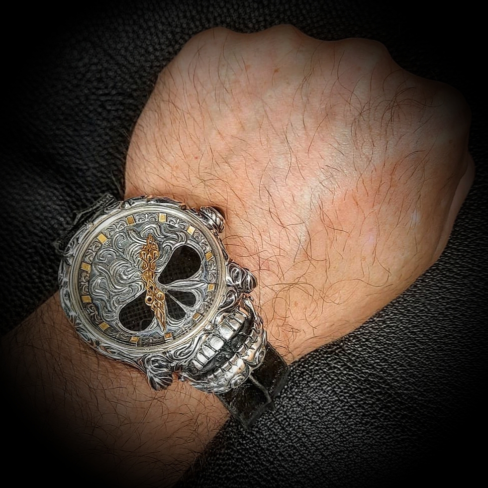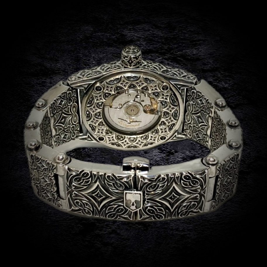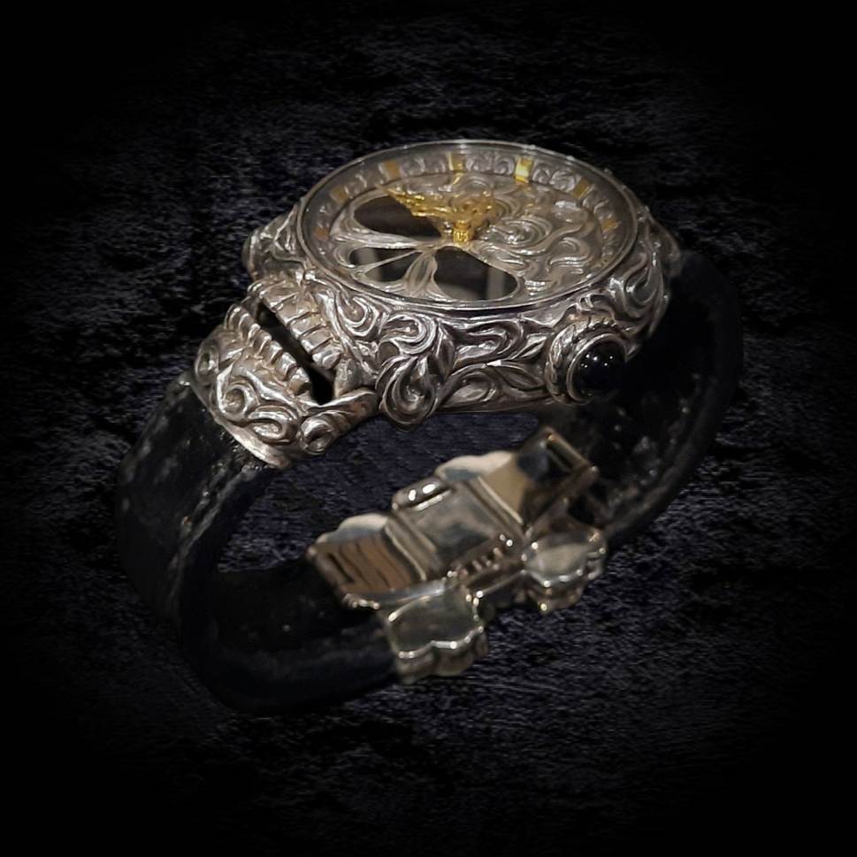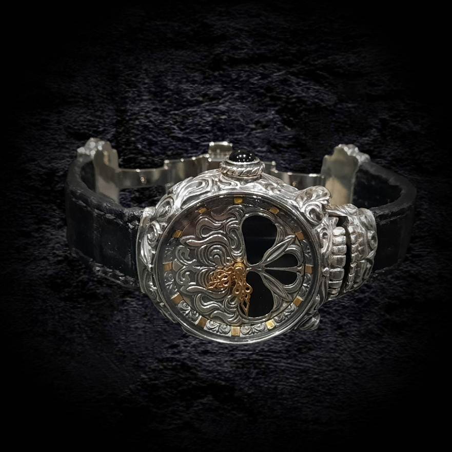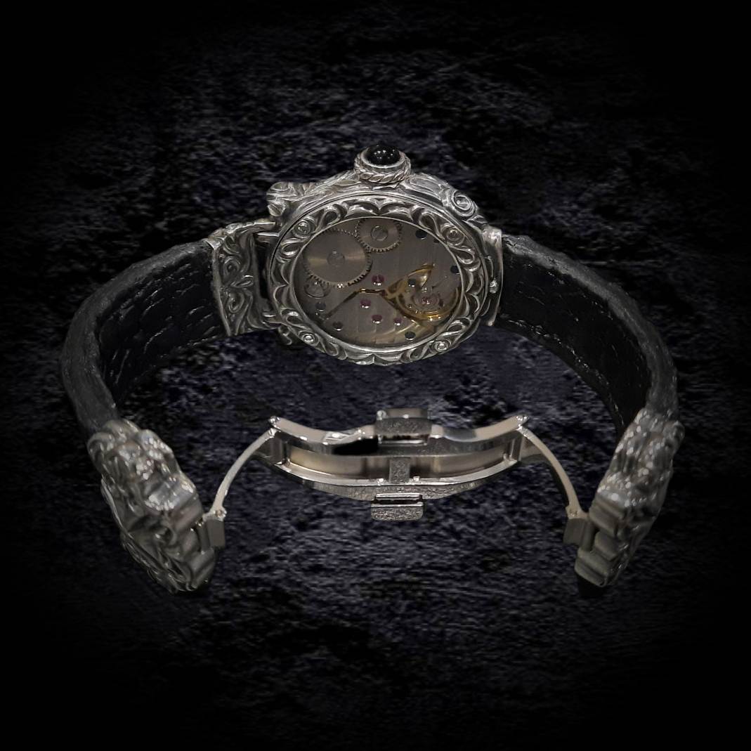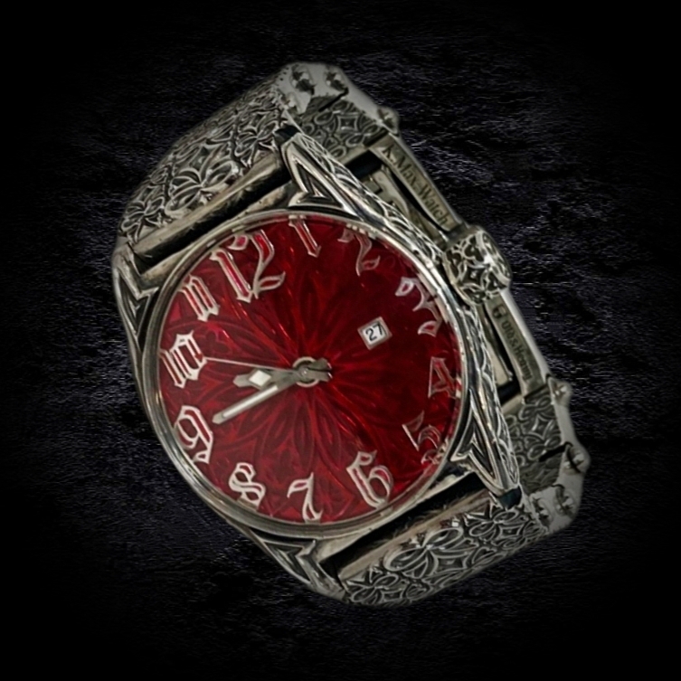 С этой легендарной модели началась история коллекции K.Max.Watch. В "ТРИУМФ 2.0" запечатлен дух свободы и бунтарства, присущий миру байкеров. Это квинтэссенция брутальности, облаченная в классическую форму. Мальтийские кресты, геральдические лилии, зловещие черепа – символы, сплетающиеся в причудливый барочно-готический орнамент. Кажется, будто фантастические растения проросли сквозь металл, создавая завораживающий узор. Циферблат – сердце композиции – пронизан символизмом. Увенчанный короной крылатый череп, покоящийся на фоне скрещенных мечей, повествует о победе духа над бренностью. Задняя крышка часов предоставляет возможность персонализации: герб, логотип, вензель или любой другой рисунок, отражающий индивидуальность владельца, может быть нанесен по желанию. Часы "ТРИУМФ 2.0" – это не просто часы, это манифест. Они станут бескомпромиссным аксессуаром, подчеркивающим брутальный стиль мужчины, готового бросить вызов и заявить о себе во весь голос.