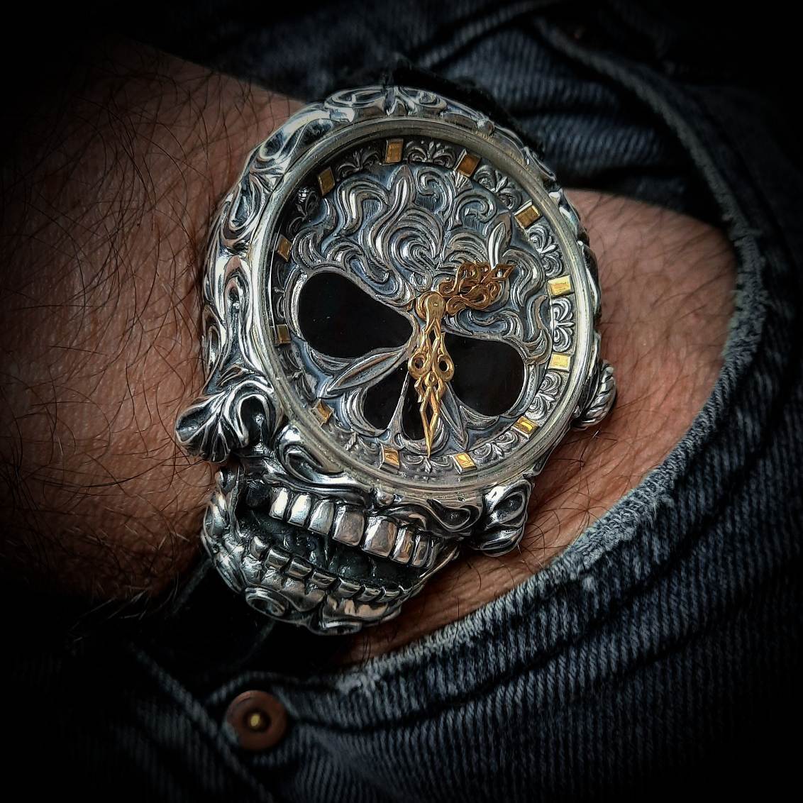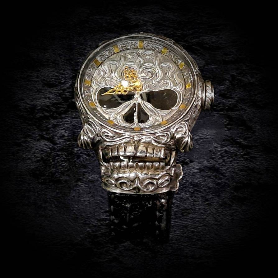 Мужские серебряные часы "КОСТИ". Аксессуар, пропитанный тьмой и величием. Брутальный дизайн этих массивных часов создан для тех, кто ценит мрачную эстетику готического стиля. Четыре зловещих черепа на циферблате – безмолвные стражи, отмечающие неумолимый бег времени, символизируя четыре времени суток. Корпус, искусно выполненный с фактурой костной ткани, словно вырван из самого сердца вечной мерзлоты. Завершает этот шедевр уникальный браслет, воплощенный в форме сдвоенного змеиного хребта, с пугающей точностью повторяющий анатомию пресмыкающегося. "КОСТИ" – часы для тех, кто не боится заглянуть в лицо смерти и видит красоту в её леденящем прикосновении.