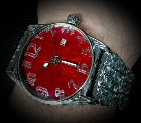 В дизайне этих часов, одновременно изящных, массивных и брутальных, угадывается утонченное влияние восточного орнамента. Сюжет декора – причудливое переплетение невиданных цветов и растений, словно заимствованное из сказочных садов, контрастирует с отблесками стали доспехов и воинственным лязгом оружия восточного воина. Браслет – это эксклюзивное сочетание звеньев, украшенных филигранным прорезным узором, каждое из которых неповторимо. Заднюю крышку этих необыкновенных часов можно персонализировать, нанеся по желанию заказчика инициалы, монограмму или фамильный герб.